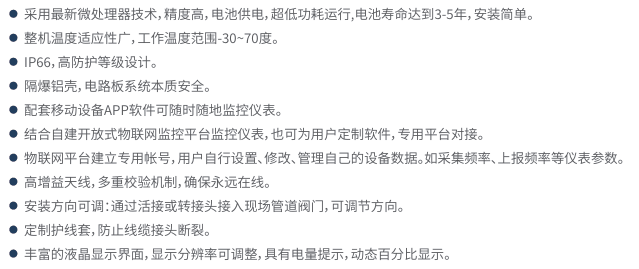 无线智能压力变送器是基于无线通讯网络使压力的测量、变送、上报为一体的低功耗智能仪表。集成高灵敏度压力检测元件,高精度信号调整电路,低功耗电池电源管理,丰富的LCD显示界面于一体。
